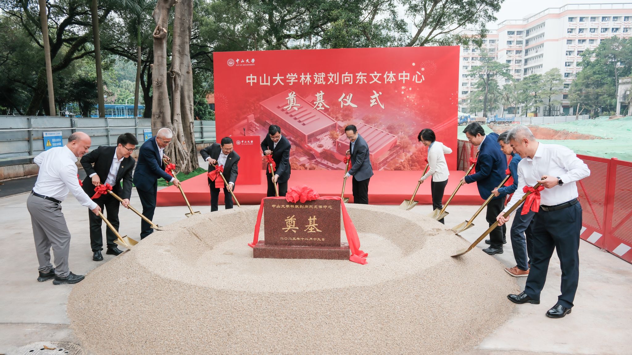 刘承功、高松、杨东华、谢湜、林斌、刘向东、刘伟等共同执铲培土,为文体中心项目奠基。